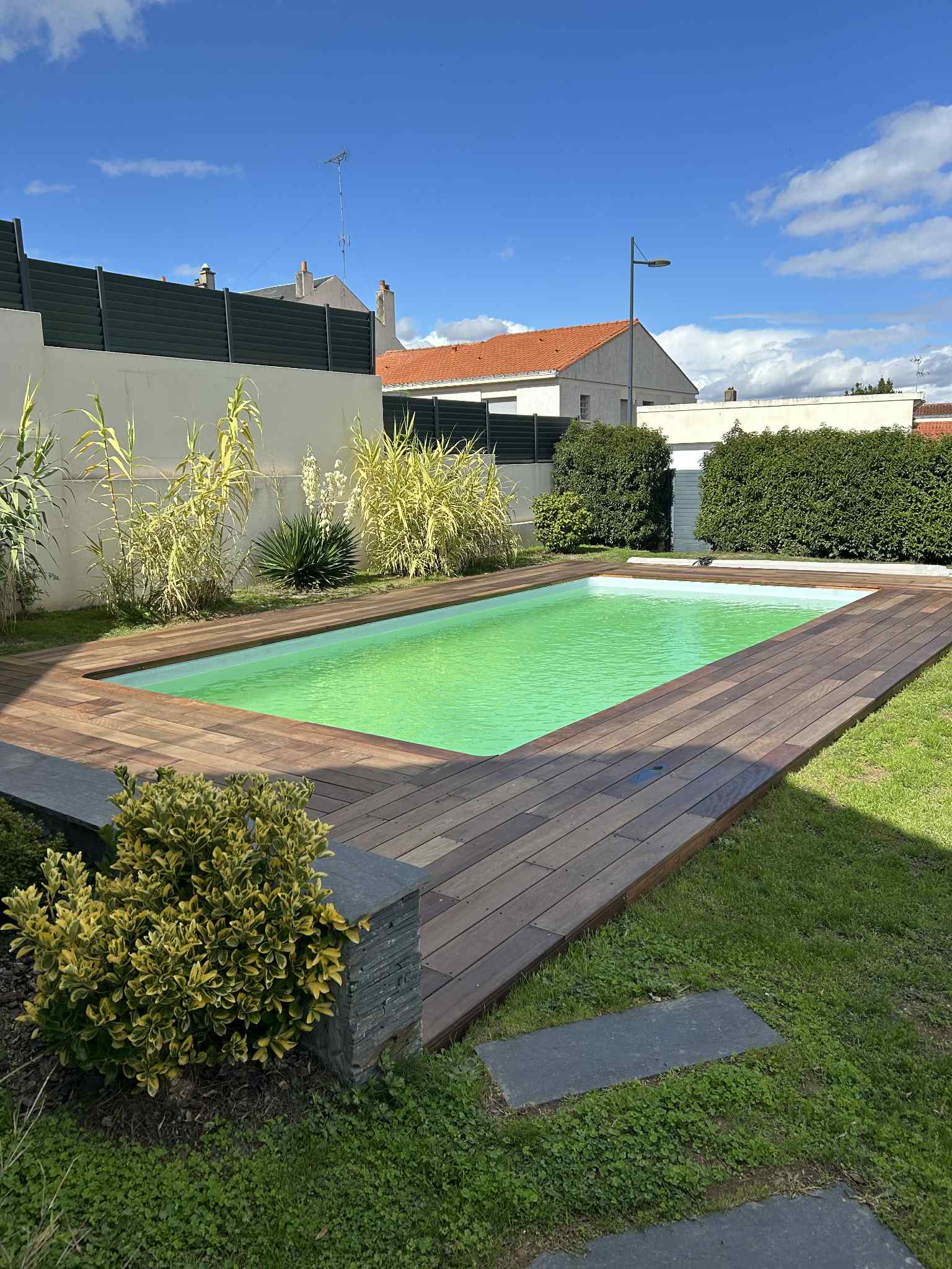 Terrasse (béton, bois, carrelage), clôture, aménagement décoratif : jardinière, béton décoratif